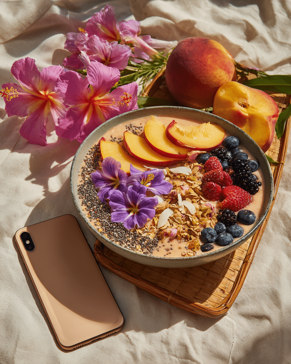 Presentation plays a big role in the appeal of smoothie bowls. Arranging peach slices, granola clusters, seeds, and berries in neat sections or creative patterns makes the bowl look vibrant and inviting. Using contrasting colors, like the bright orange of peaches against deep purple berries, enhances visual impact. Natural lighting and a clean background help capture the freshness and beauty of the bowl for sharing on social media.