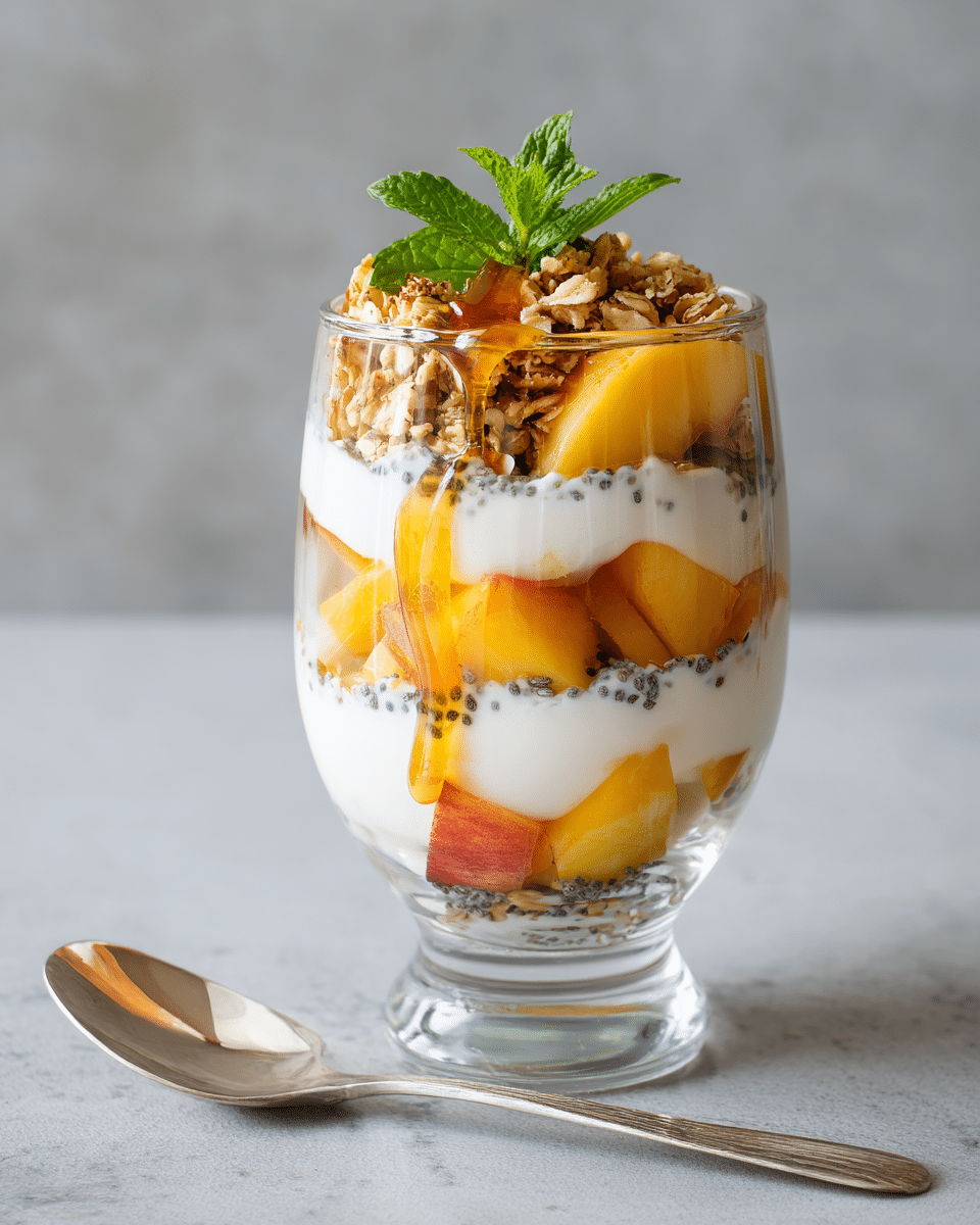 Peach Yogurt Parfait is not only delicious but also packed with nutritional goodness. The fresh peaches provide essential vitamins like vitamin C and A, along with dietary fiber that supports digestion. Greek yogurt adds a high-quality source of protein and probiotics, which contribute to gut health. Together, these ingredients make the parfait a balanced option for a wholesome breakfast or snack that fuels the body and promotes overall wellness.