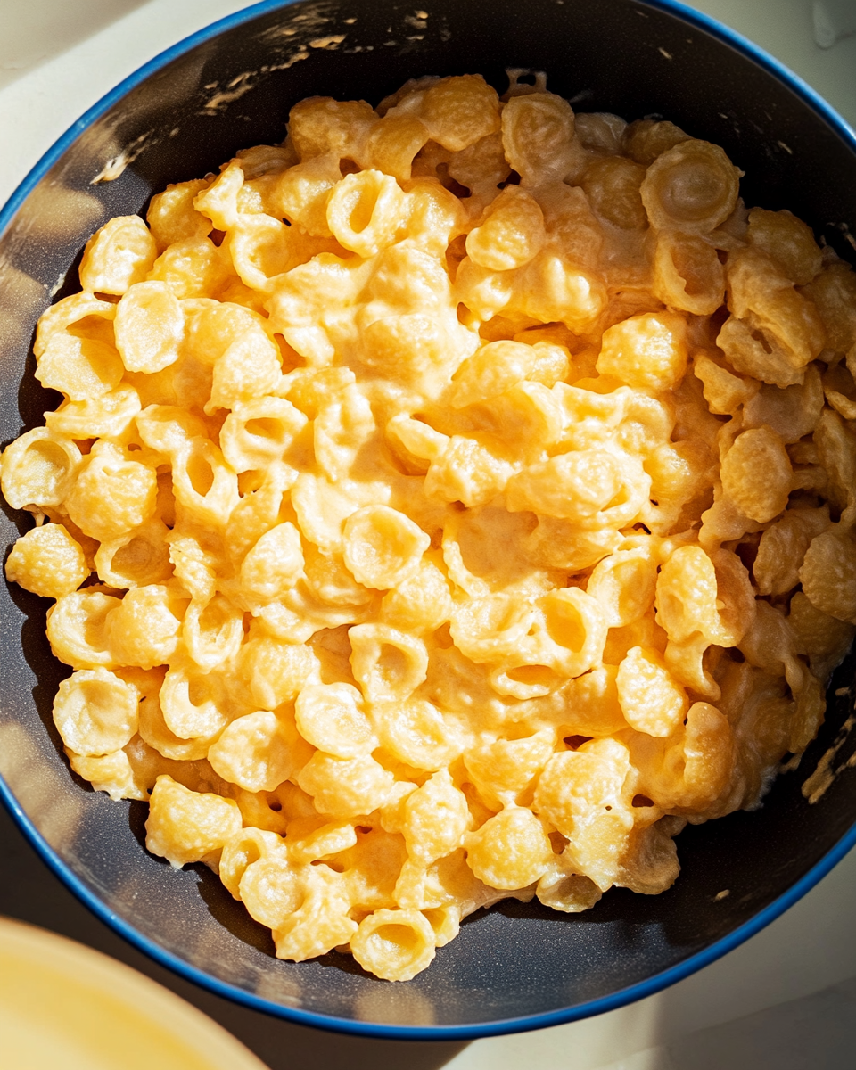- In a large bowl, combine the cooked macaroni and the cheese sauce. Mix until the pasta is well coated.
